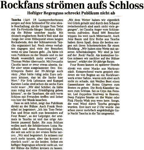 Die Rocknacht in Taucha hat schon Tradition. Auch in diesem Jahr strömten wieder über 600 Besucher auf den Schlosshof. Kein Wunder: mit Four Roses, Tom Twist, Sons-in-Law und Amok gab es Rock vom Feinsten. Los ging es pünktlich um 20 Uhr als Klaus-Dieter Münch, der Vorsitzende des Schlossvereins, den Abend eröffnete. Die Band Amok, eine Deutschrockband aus Leipzig, stand schon in den Startlöchern. Mit eingehenden Texten sangen sie sich in die Herzen der Besucher. Nach einer Stunde der fliegende Wechsel. Es kamen mit Tom Twist die Herren des Rock´n Roll auf die Bühne. Nun waren Pettycoat und Rock´n Roll angesagt.